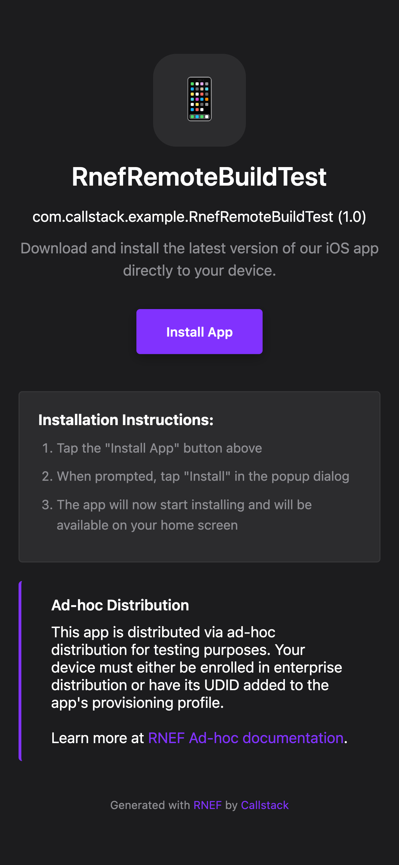 This index.html file will display an ad-hoc distribution web portal, allowing developers and testers to install apps on their provisioned devices by simply clicking "Install App".